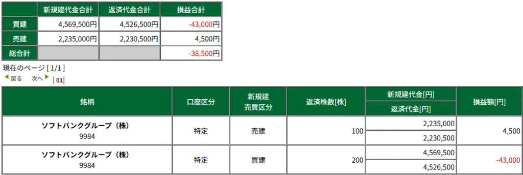 SBGの本日の底値あたりでナンピン。後場から少し反発してくれたので、損益がプラ転したところでナンピン分を利確。損失を若干抑えられたのと、取得単価を少しさげることができた。